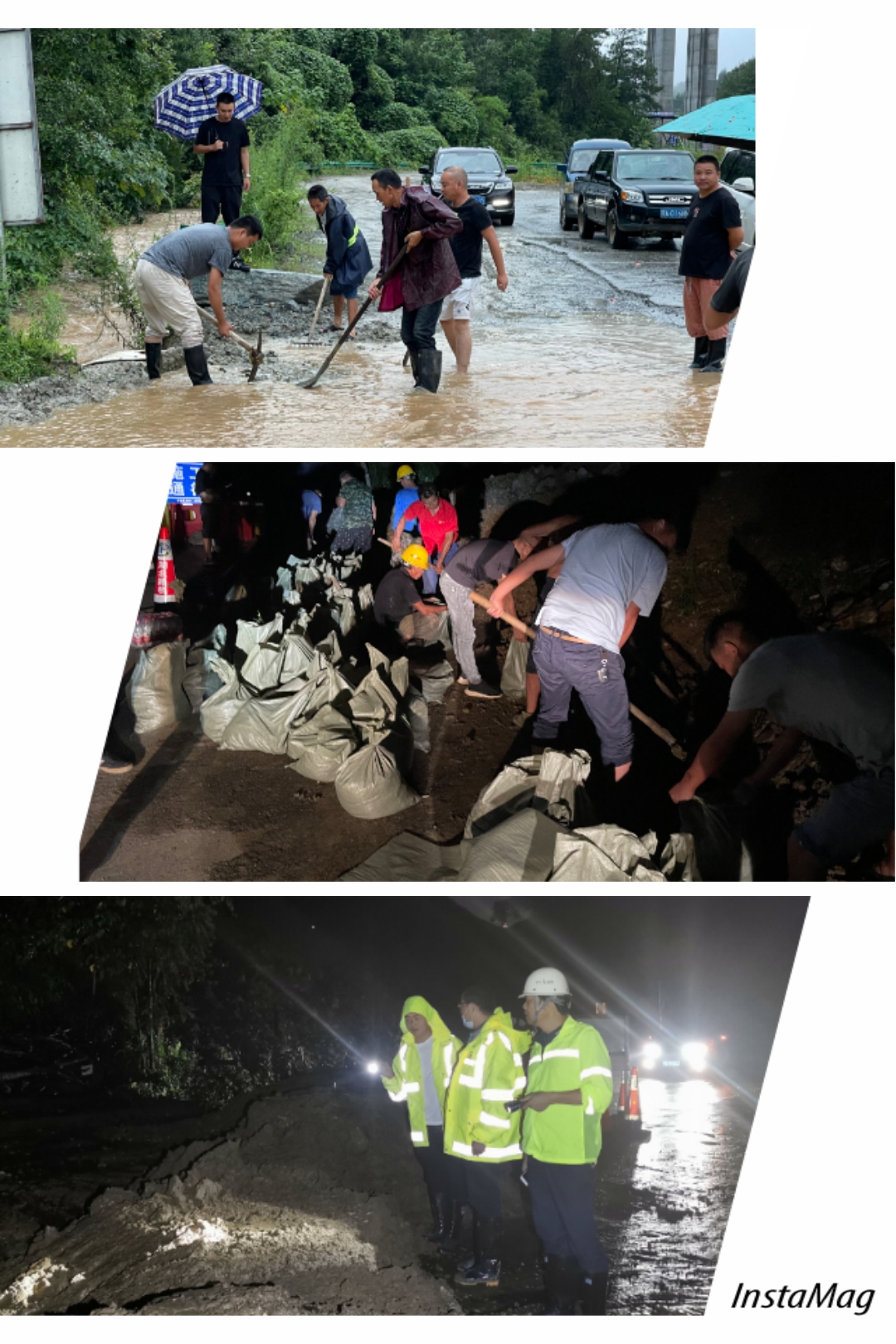 十淅2標(biāo)項(xiàng)目降雨前深入現(xiàn)場(chǎng)針對(duì)排水系統(tǒng)、高邊坡穩(wěn)定性等開(kāi)展防汛隱患排查,配合政府相關(guān)部門(mén)對(duì)可能發(fā)生重大險(xiǎn)情的地段進(jìn)行三次摸查,重點(diǎn)加強(qiáng)了三清廟大橋、E匝道橋、路基六隊(duì)等汛情多發(fā)地的監(jiān)控。暴雨來(lái)臨后,十淅項(xiàng)目與時(shí)間賽跑,組織工人上足機(jī)械設(shè)備,建立沙壩防汛搶險(xiǎn),一周內(nèi)搶通村道十余公里,與地方村委會(huì)一同轉(zhuǎn)移受災(zāi)群眾十余戶,爭(zhēng)取將當(dāng)?shù)負(fù)p失降到最低。