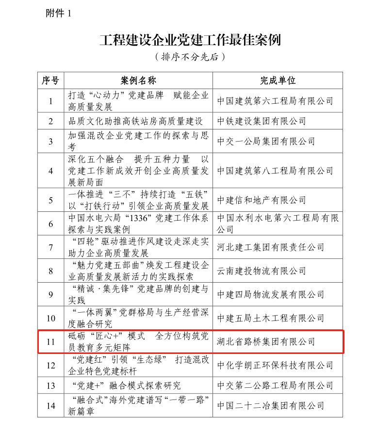 6月2日,中國施工企業(yè)管理協(xié)會公布了2023年“工程建設(shè)企業(yè)黨建工作最佳案例和優(yōu)秀案例”的名單,湖北路橋“匠心+”教育模式順利入選“工程建設(shè)企業(yè)黨建工作最佳案例”。