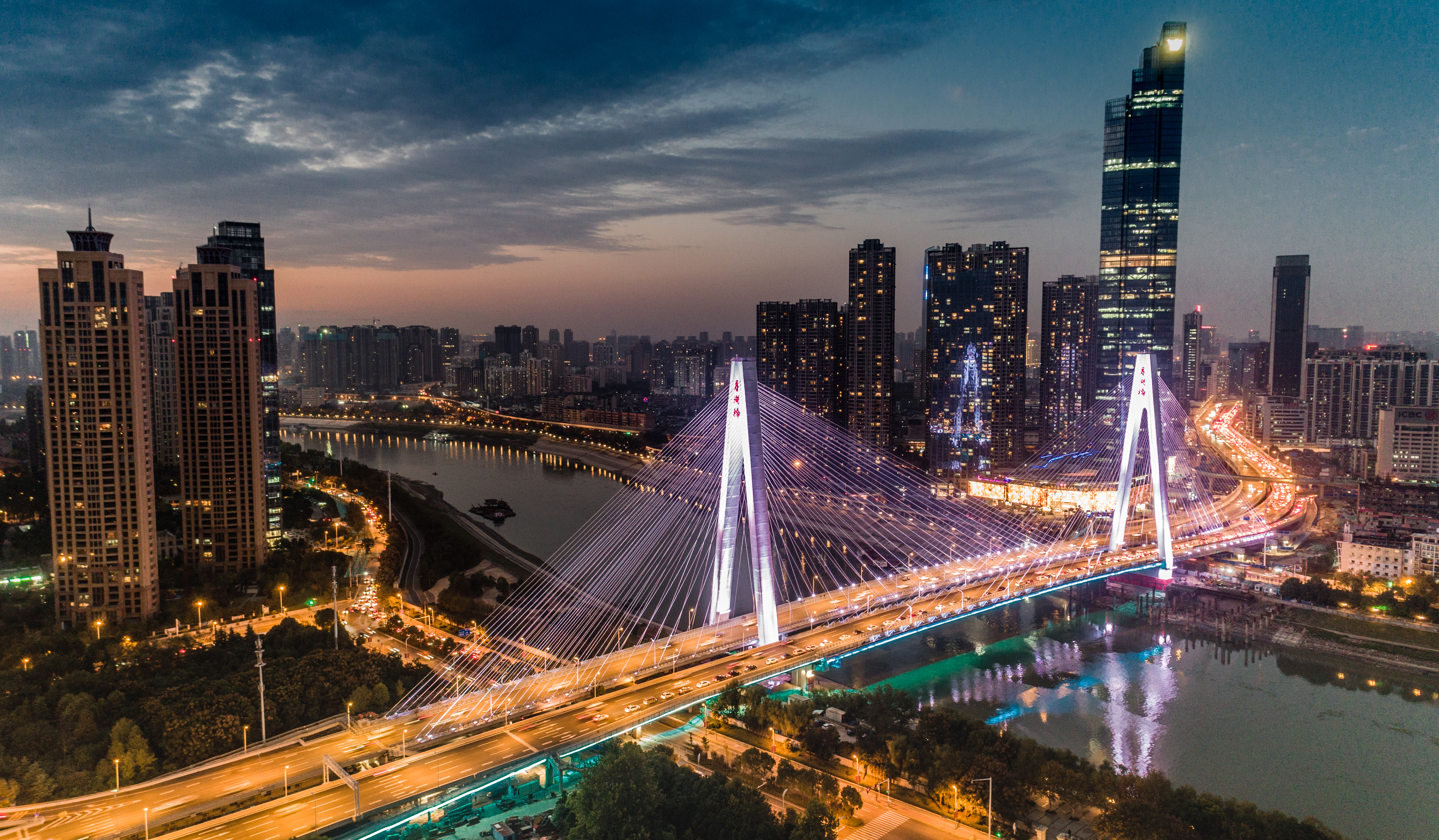 江漢四橋工程南起漢陽(yáng)梅子山通道,北至漢口京漢大道,全長(zhǎng)約1.86KM,主線按城市快速路標(biāo)準(zhǔn)建設(shè),設(shè)計(jì)時(shí)速60KM∕h、設(shè)雙向6車道,地面輔道按城市次干路標(biāo)準(zhǔn)建設(shè),設(shè)計(jì)時(shí)速40KM∕h、設(shè)雙向4-6車道。工程內(nèi)容主要包括:拓寬既有梅子山通道、新建江城大道下穿琴臺(tái)大道地下通道、在既有月湖橋下游新建一幅跨江大橋及兩岸引橋、新建琴臺(tái)大道上跨江城大道高架橋,以及相配套的人行天橋、通道、道路排水、交通、綠化、照明等工程。項(xiàng)目于2018年8月31日建成通車。