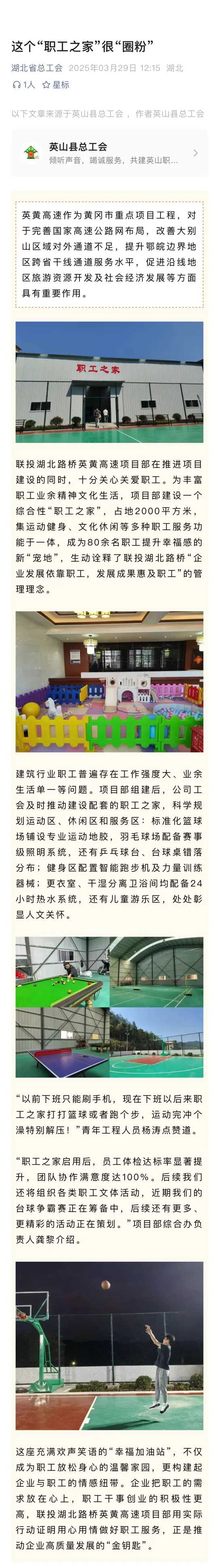聯(lián)投湖北路橋英黃高速項目部在推進項目建設的同時,十分關心關愛職工。為豐富職工業(yè)余精神文化生活,項目部建設一個綜合性“職工之家”,占地2000平方米,集運動健身、文化休閑等多種職工服務功能于一體,成為80余名職工提升幸福感的新“寵地”,生動詮釋了聯(lián)投湖北路橋“企業(yè)發(fā)展依靠職工,發(fā)展成果惠及職工”的管理理念。近日,湖北省總工會進行深入報道,全文如下: