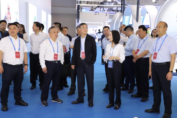 圖:中國(guó)交通運(yùn)輸協(xié)會(huì)副會(huì)長(zhǎng)兼秘書長(zhǎng)李剛(第一排左三)參觀湖北路橋展臺(tái)
