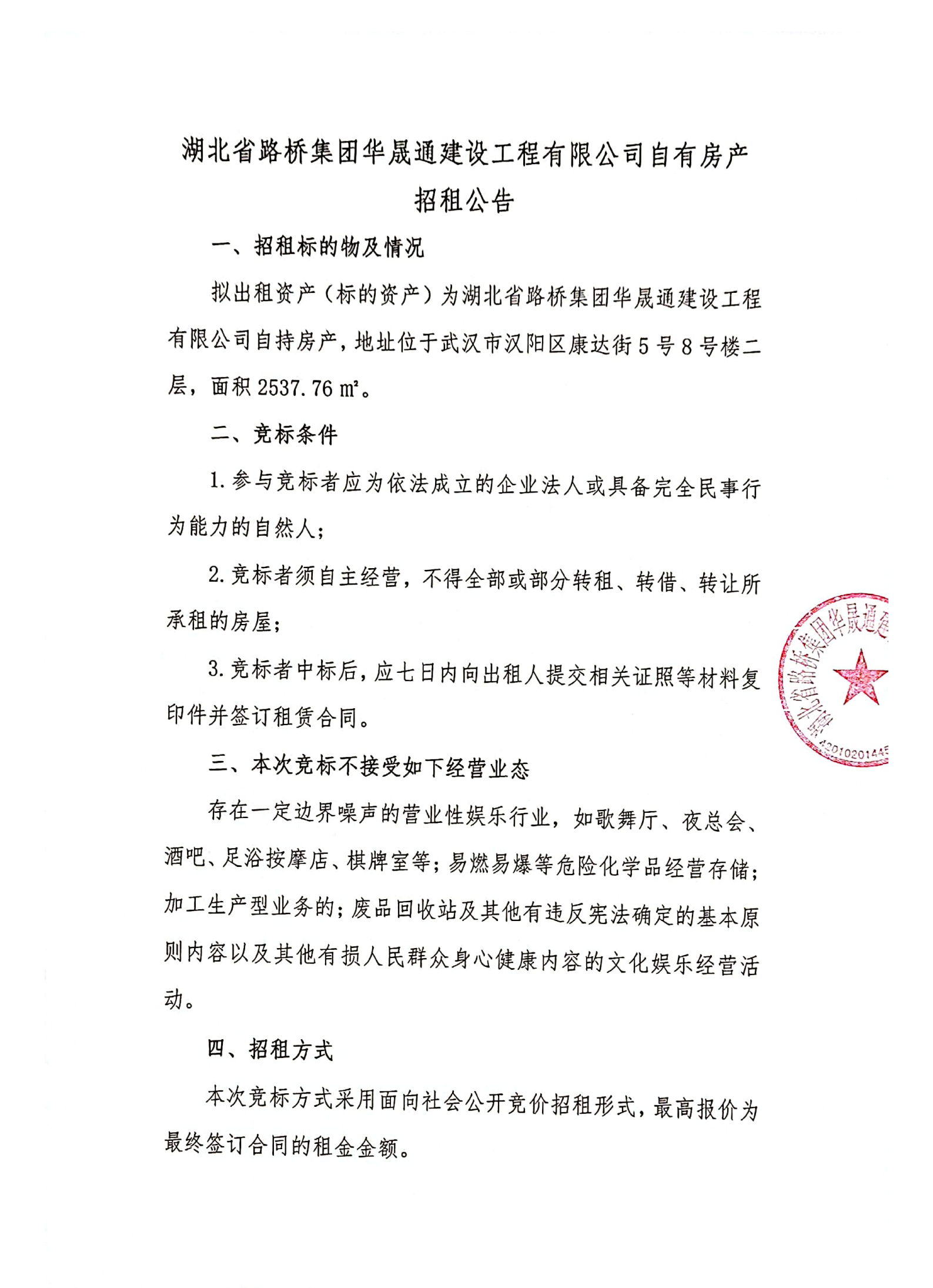 湖北省路橋集團華晟通建設(shè)工程有限公司自有房產(chǎn)招租公告